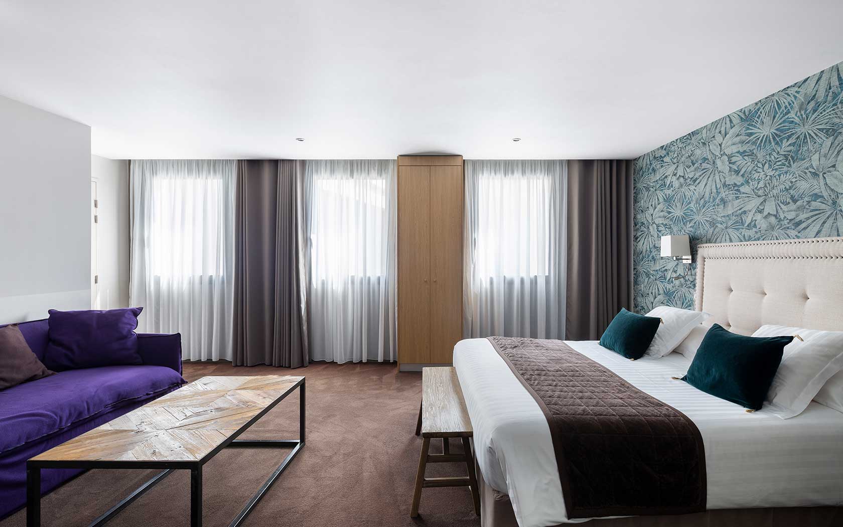 Like a cozy nest, our attic rooms will be ideal for those who love “cocoon” atmospheres. Unless you prefer a courtyard room or a garden-level room! The little extra? Connecting rooms and suites for families, three rooms equipped to accommodate people with reduced mobility, and apart’hotels with a strong personality for 1 to 4 people.